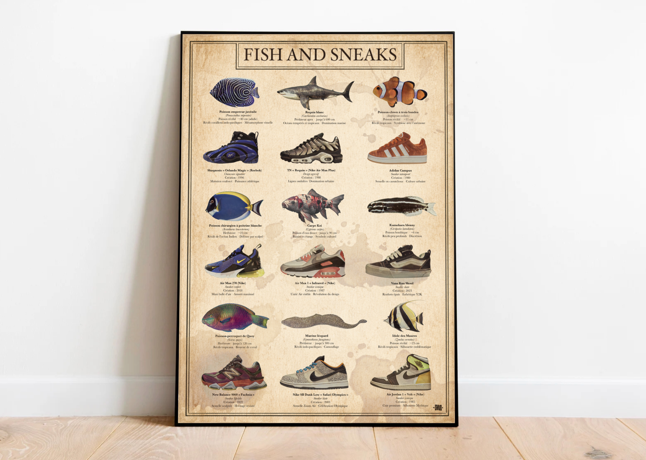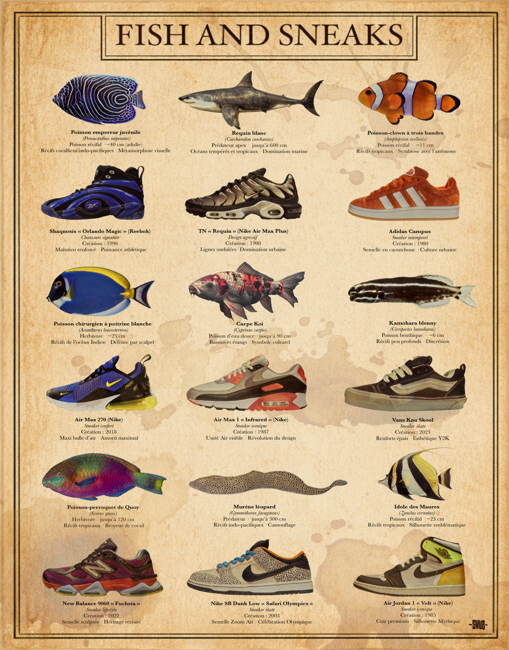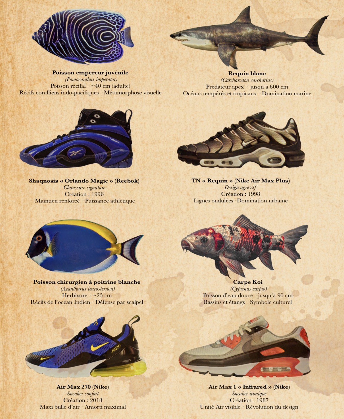 Dans ce tableau pensé comme un tableau scientifique pop, neuf sneakers font face à neuf poissons, réunis dans une même composition où les lignes, les couleurs et les caractères se répondent. Chaque paire trouve son écho dans une espèce marine : la Nike Air Max 1 Infrared rencontre la Carpe koï, entre éclat vif et élégance intemporelle,  la Nike Air Max Plus se mesure au requin, silhouette nerveuse et puissance assumée,  la Adidas Campus Orange croise le poisson-clown, dans un jeu solaire et malicieux.